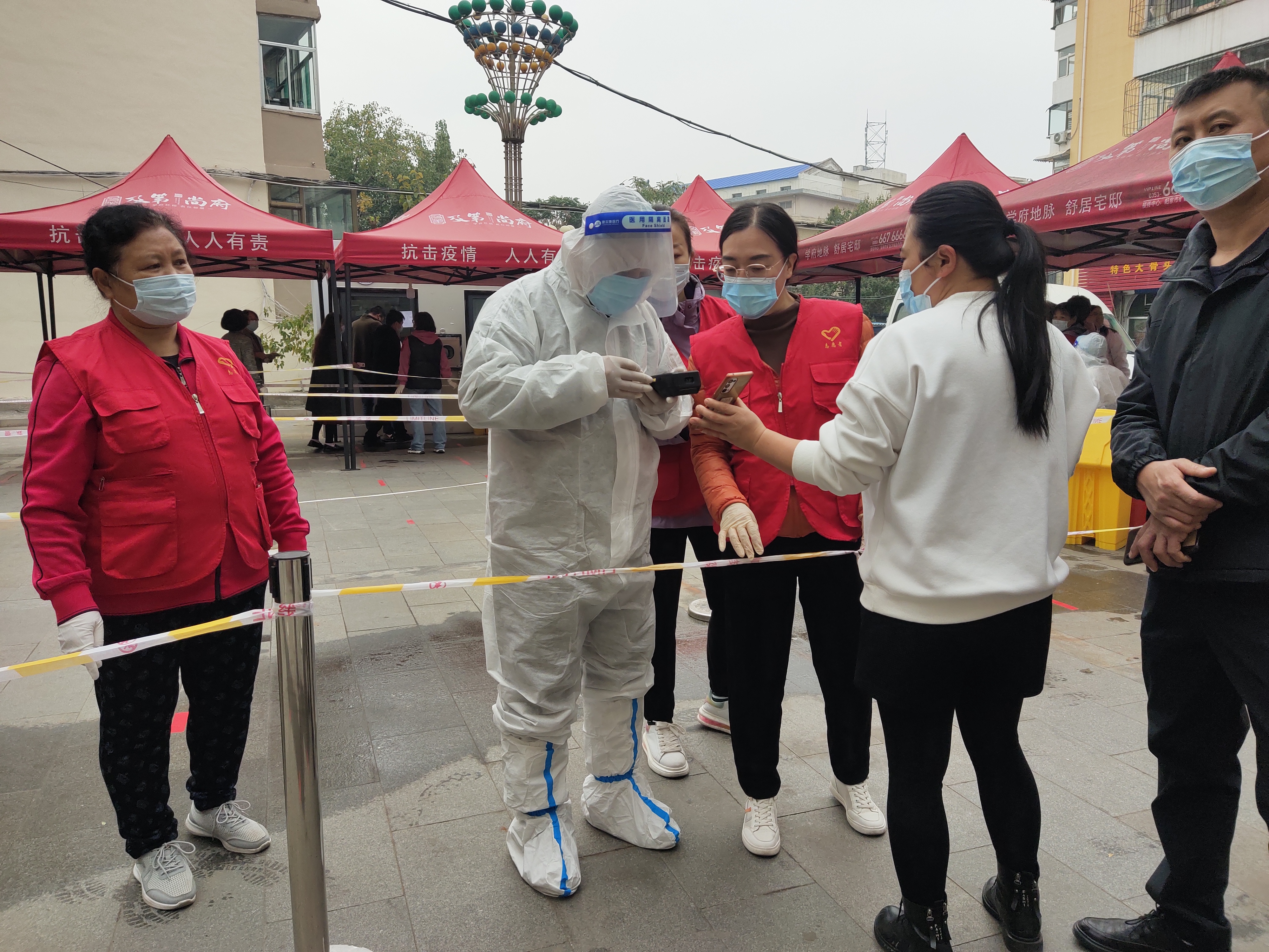 领导干部带头开展志愿服务,值守在高速口,不论白天黑夜,严格入境车辆人员的登记检查。为保障全员核酸,志愿者们提前按照防疫要求,协助社区搭建检测帐篷,固定隔离带,设置临时隔离点和核酸检测点,悬挂警示标识,粘贴一米线标……大家干得热火朝天,忙碌有序。经过几个小时紧张忙碌的奋战,几个秩序井然的核酸检测点完美落成。