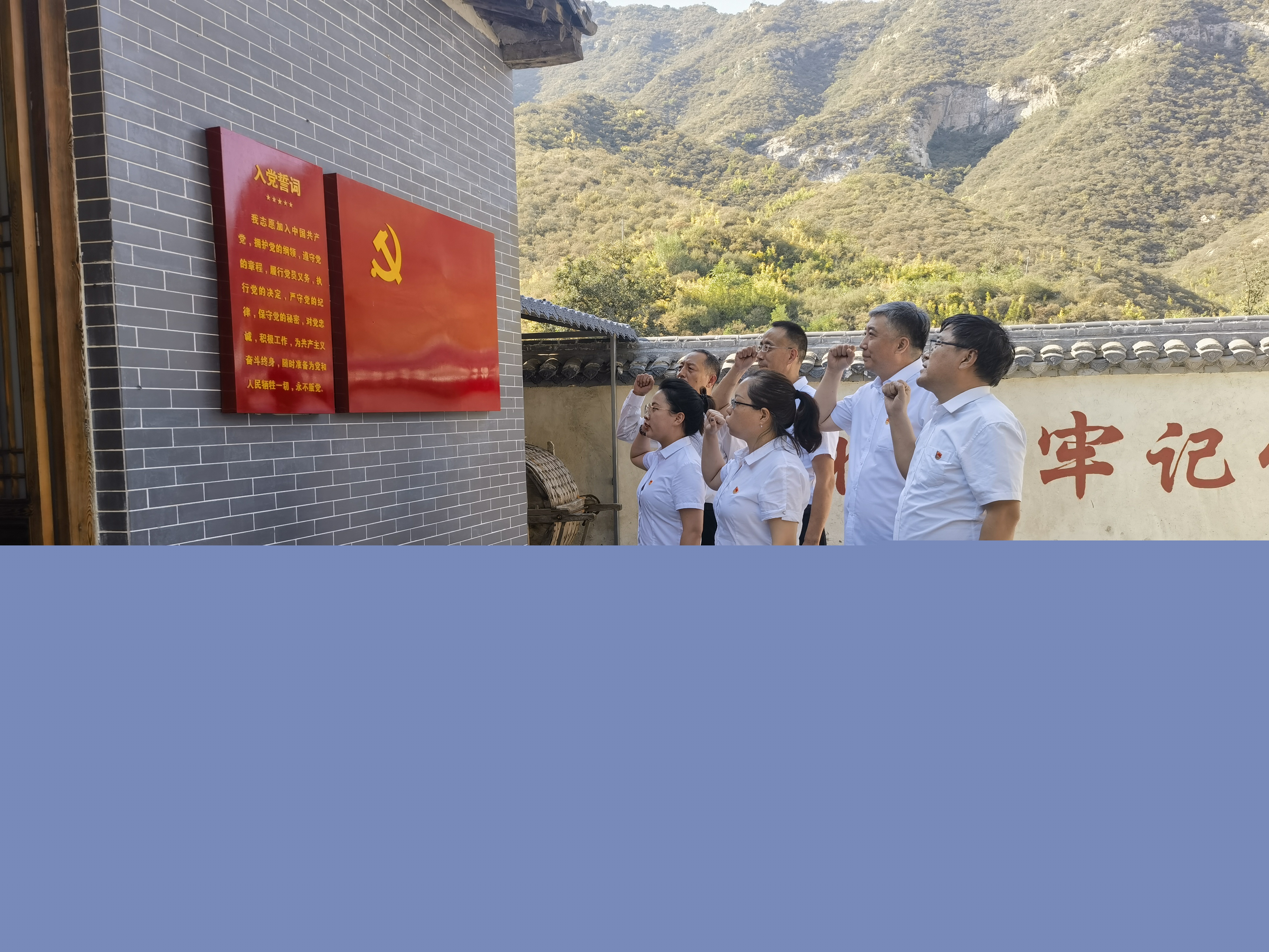 在抗战时期盂县党政机关旧址,面对鲜红的党旗,党员们举起右手,紧握拳头,以最洪亮的声音,最崇高的敬意,重温了入党誓词。铮铮誓词,表达了对革命先烈的诚挚敬意和对党的事业奋斗终身的不悔誓言,表达了紧跟核心、踔厉奋发勇毅前行的决心。